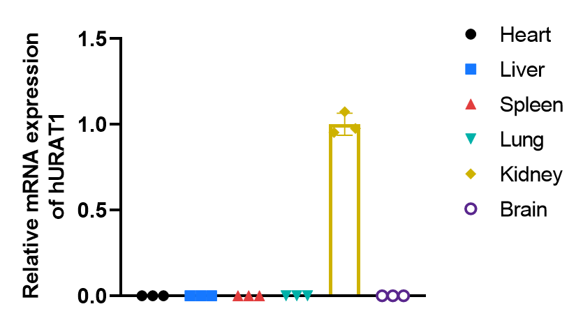 Strain specific analysis of URAT1 gene expression in wild-type C57BL/6JNifdc mice and B-hURAT1 mice by RT-qPCR. Tissue RNA were isolated from homozygous B-hURAT1 mice (H/H) (male, 7w, n=3). Human URAT1 mRNA was exclusively detectable in kidneys of homozygous B-hURAT1 mice. Values are expressed as mean ± SEM. Significance was determined by unpaired t-test. *P < 0.05, **P < 0.01, ***P < 0.001.