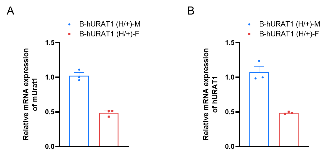 Species specific analysis of URAT1 mRNA expression in heterozygous B-hURAT1 mice by RT-qPCR. Kidney was collected from heterozygous B-hURAT1 mice (H/+) (male or female, n=3, 7-week-old). The URAT1 mRNA expression level in male mice was higher than female mice. (A) The analysis was used mouse Urat1 primer. (B) The analysis was used human URAT1 primer. Values are expressed as mean ± SEM.