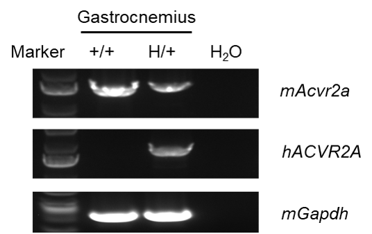 Species specific analysis of ACVR2A mRNA expression in wild-type C57BL/6JNifdc mice and heterozygous humanized B-hACVR2A mice by RT-PCR. Gastrocnemius were collected from wild-type C57BL/6JNifdc mice (+/+) and heterozygous B-hACVR2A mice (H/+), then cDNA libraries were synthesized by reverse transcription, followed by PCR with mouse or human ACVR2A primers. Human ACVR2A mRNA was detectable only in heterozygous B-hACVR2A mice, but not in wild-type C57BL/6JNifdc mice. Human sequences were confirmed via Sanger Sequencing.
