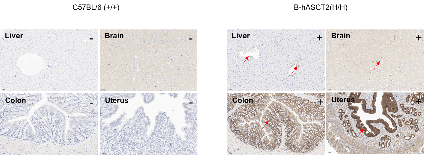 Immunohistochemical analysis of ASCT2 protein expression in B-hASCT2 mice. Tissues were collected from wild-type C57BL/6 mice (+/+) and homozygous B-hASCT2 mice (2 females, 20-weeks-old) for IHC analysis. Tissues were stained with an anti-human ASCT2 antibody (abcam, ab237704). The results demonstrated that human ASCT2 were expressed in the liver, brain, colon, and uterus from B-hASCT2 mice. The plus sign (+) denotes positive staining, while the minus sign (-) denotes negative staining. Positive signals are indicated by arrows in the figure.
