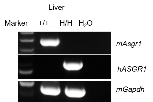 Species-specific analysis of ASGR1 gene expression in wild-type C57BL/6JNifdc mice and homozygous humanized B-hASGR1 mice by RT-PCR. Liver was collected from wild-type C57BL/6JNifdc mice (+/+) and homozygous B-hASGR1 mice (H/H). Mouse Asgr1 mRNA was detectable only in wild-type C57BL/6JNifdc mice. Human ASGR1 mRNA was detectable only in homozygous B-hASGR1 mice, but not in wild-type C57BL/6JNifdc mice.