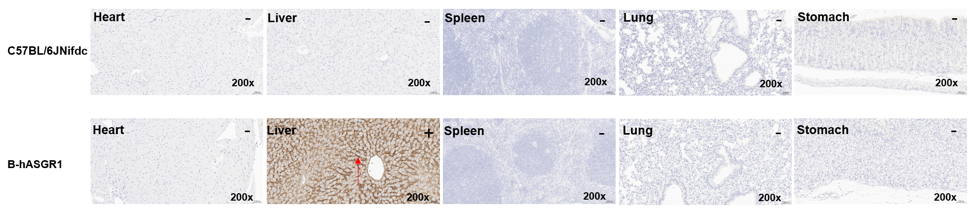 Immunohistochemical (IHC) analysis of ASGR1 protein expression in C57BL/6JNifdc wild-type (WT) mice and B-hASGR1 mice. The heart, liver, spleen, lung, and stomach were collected from C57BL/6JNifdc (+/+) and homozygous B-hASGR1 mice (H/H) (female, 6-week-old), and analyzed by IHC with anti-ASGR1 antibody (ab254261). Human ASGR1 was only detectable in homozygous B-hASGR1 mice. The arrow indicates tissue cells with positive ASGR1 staining (brown). Scale bar = 50 µm.