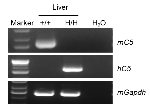 Strain specific analysis of C5 mRNA expression in wild-type C57BL/6JNifdc mice and homozygous B-hC5 mice plus by RT-PCR. Liver RNA were isolated from wild-type C57BL/6JNifdc mice (+/+) and homozygous B-hC5 mice plus (H/H), then cDNA libraries were synthesized by reverse transcription, followed by PCR with mouse and human C5 primers. Mouse C5 mRNA was detectable only in liver of wild-type C57BL/6JNifdc mice (+/+). Human C5 mRNA was exclusively detectable in homozygous B-hC5 mice plus (H/H) but not in wild-type mice.
