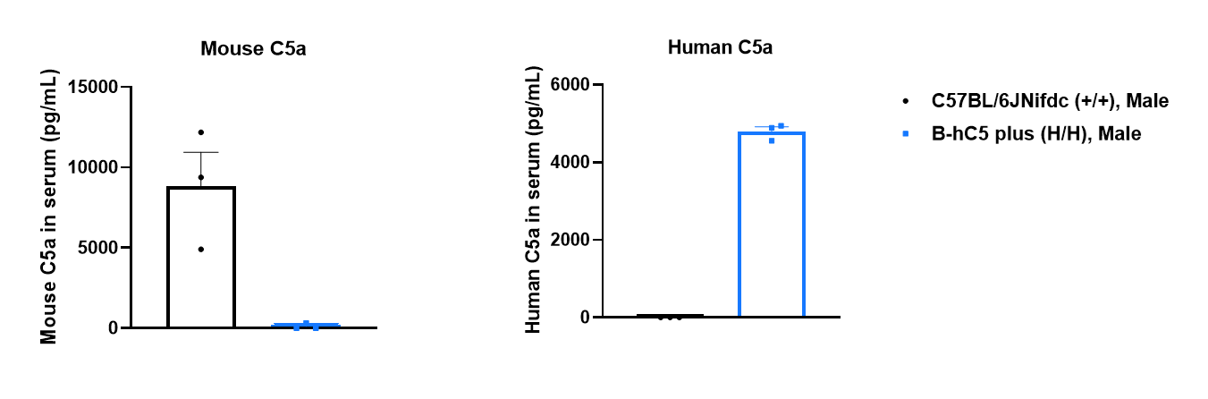 Strain specific C5a expression analysis in wild-type C57BL/6JNifdc mice and homozygous B-hC5 mice plus by ELISA. Serum was collected from wild-type C57BL/6JNifdc mice (+/+) and homozygous B-hC5 mice plus (H/H) (male, 8 weeks old, n=3). Expression levels of mouse and human C5a were analyzed by ELISA (anti-mouse C5a ELISA kit: Abcam, ab193718; anti-human C5a ELISA kit: Abcam, ab193695). Mouse C5a was only detectable in wild-type C57BL/6JNifdc mice. Human C5a was exclusively detectable in homozygous B-hC5 mice plus. Values are expressed as mean ± SEM.