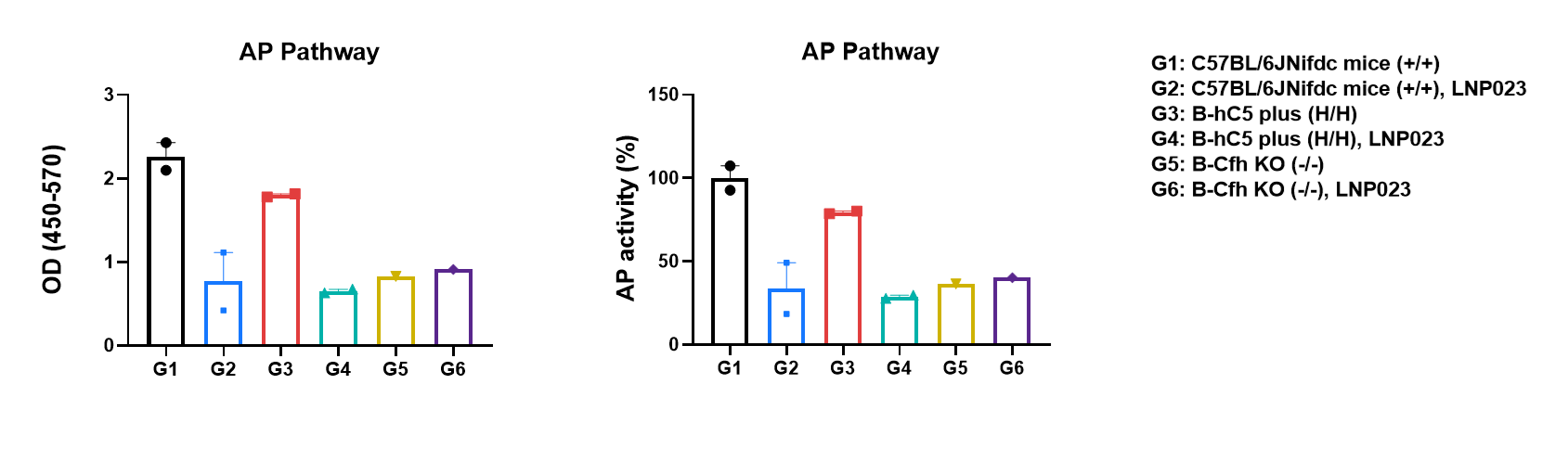 In vitro functional analysis of the alternative pathway. Serum was collected from wild-type C57BL/6JNifdc mice (+/+), homozygous B-hC5 mice plus (H/H), and B-Cfh KO mice (-/-) (male, 8 weeks old, n=1-2) and evaluated the functional activity with the complement kit (Alternative Complement Pathway, Mouse Assay, Hycult Biotech, HIT422). LNP023 is an inhibitor of the alternative complement pathway by targeting factor B (1μM, 15 min, RT). Serum was pre-treated with LNP023 or not. (A) The OD value in 20% serum dilutions. (B) Alternative pathway activity compared with wild-type mice. B-Cfh KO mice were the negative control, since the deficiency of CFH aggravates the cleavage of C3 in serum, leading to a decrease in the alternative pathway activity.