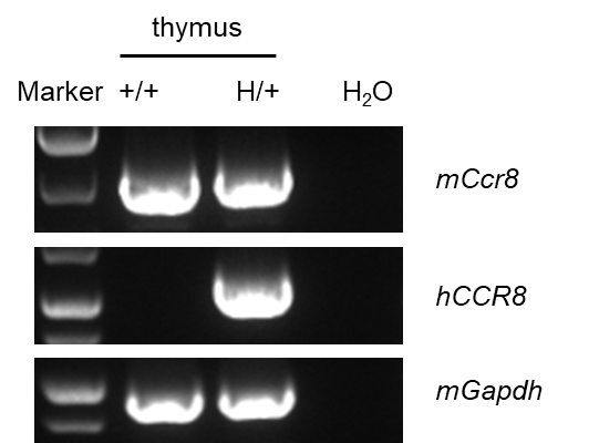 Strain specific analysis of CCR8 mRNA expression in wild-type BALB/cCrSIcNifdc mice and B-hCCR8 mice(C) by RT-PCR. Thymus RNA was isolated from wild-type BALB/cCrSIcNifdc mice (+/+) and heterozygous (H/+), then cDNA libraries were synthesized by reverse transcription, followed by PCR with mouse or human CCR8 primers. Mouse Ccr8 mRNA was detectable in wild-type BALB/cCrSIcNifdc mice and heterozygous B-hCCR8 mice(C). Human CCR8 mRNA was detectable in heterozygous B-hCCR8 mice(C) but not in wild-type BALB/cCrSIcNifdc mice.