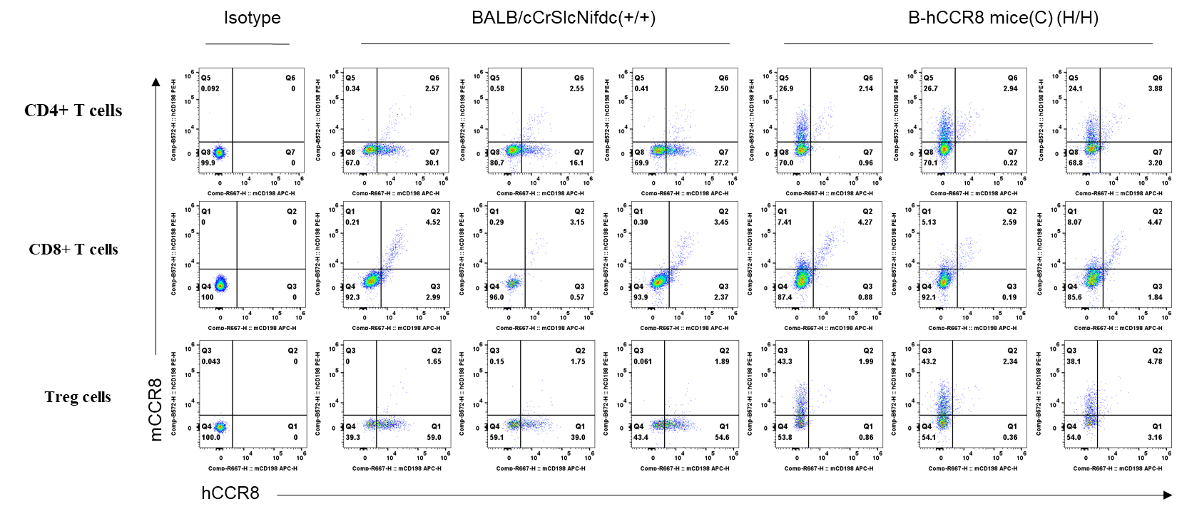 CCR8 expression analysis in B-hCCR8 mice(C) by FACS. Colon cancer CT26.WT cells were inoculated into wild-type BALB/cCrSIcNifdc (+/+) and homozygous B-hCCR8 mice(C) (H/H). Tumor cells were harvested after tumor growth and analyzed by flow cytometry with species-specific anti-mouse CCR8 antibody (Biolegend, 150310) and anti-human CCR8 antibody (Biolegend, 365804). Mouse CCR8 was both detectable on CD4+ T cells and Treg cells in tumors of wild-type BALB/cCrSIcNifdc mice but not in homozygous B-hCCR8 mice(C), and human CCR8 was only detectable in homozygous B-hCCR8 mice(C).