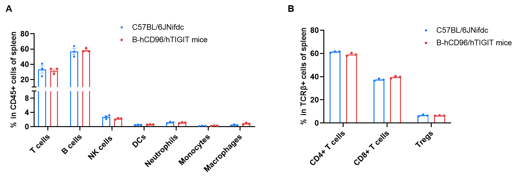 Frequency of leukocyte subpopulations in spleen by flow cytometry. Splenocytes were isolated from wild-type C57BL/6JNifdc mice (female, n=3, 8-week-old), homozygous B-hCD96/hTIGIT mice (female, n=3, 8-week-old). A. Flow cytometry analysis of the splenocytes was performed to assess the frequency of leukocyte subpopulations. B. Frequency of T cell subpopulations. Percentages of T cells, B cells, NK cells, dendritic cells, neutrophils, monocytes, macrophages, CD4+ T cells, CD8+ T cells and Tregs in B-hCD96/hTIGIT mice were similar to those in C57BL/6JNifdc. Values are expressed as mean ± SEM. Significance was determined by two-way ANOVA test.  *P < 0.05, **P < 0.01, ***p < 0.001.