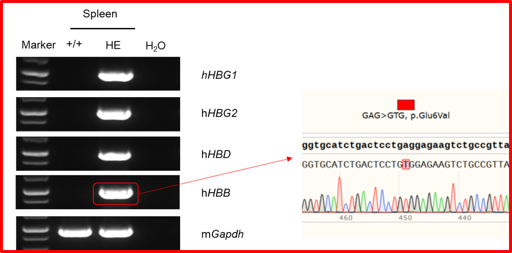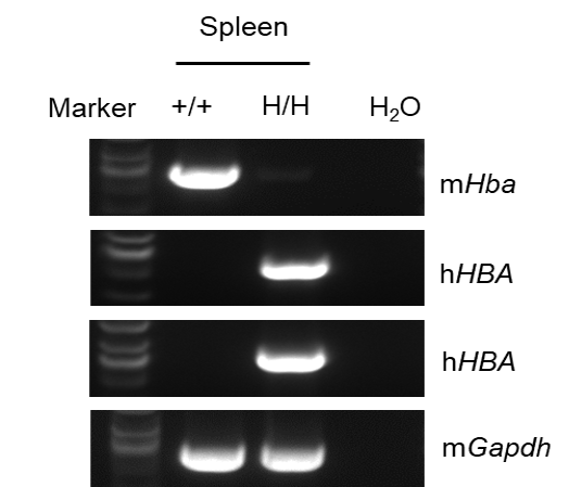 • mRNA expression analysis: Mouse Hba mRNA was exclusively detectable in wild-type mice but not in homozygous B-hHBA1/hHBA2 mice(129S2). Human HBA1 and HBA2 mRNA was exclusively detectable in homozygous B-hHBA1/hHBA2 mice(129S2). HBG1, HBG2, HBD and HBB mRNA were exclusively detectable in heterozygous B-hHBG1/hHBG2/hHBD/hHBBs mice but not in wild-type mice.