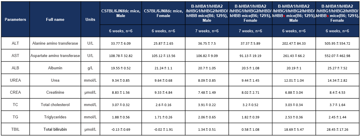 • The complete blood count test results revealed a substantial decline in RBC, HGB, HCT and PLT and a significant increase in WBC, RDW, NRBC#, NRBC%, RET#, and RET% in homozygous B-hHBA1/hHBA2/hHBG1/hHBG2/hHBD/hHBBs mice(B6; 129S) compared with wild-type C57BL/6JNifdc mice and homozygous B-hHBA1/hHBA2/hHBG1/hHBG2/hHBD/hHBB mice(B6; 129S). The blood biochemistry test results revealed a substantial increase in ALT, AST and TBIL in homozygous B-hHBA1/hHBA2/hHBG1/hHBG2/hHBD/hHBBs mice(B6; 129S).