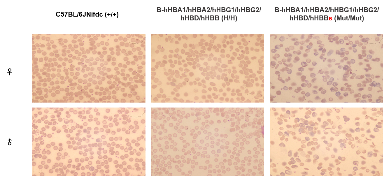 Blood smear analysis in wild-type C57BL/6JNifdc mice, homozygous B-hHBA1/hHBA2/hHBG1/hHBG2/hHBD/hHBB mice(B6; 129S) and homozygous B-hHBA1/hHBA2/hHBG1/hHBG2/hHBD/hHBBs mice(B6; 129S). The blood smear analysis results showed that the homozygous B-hHBA1/hHBA2/hHBG1/hHBG2/hHBD/hHBBs mice(B6; 129S) exhibited a distinct sickle cell phenotype.
