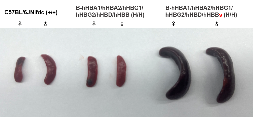 Spleen analysis in wild-type C57BL/6JNifdc mice, homozygous B-hHBA1/hHBA2/hHBG1/hHBG2/hHBD/hHBB mice(B6; 129S) and homozygous B-hHBA1/hHBA2/hHBG1/hHBG2/hHBD/hHBBs mice(B6; 129S). The spleen size of homozygous B-hHBA1/hHBA2/hHBG1/hHBG2/hHBD/hHBBs mice was significantly larger than that of wild-type C57BL/6JNifdc mice and homozygous B-hHBA1/hHBA2/hHBG1/hHBG2/hHBD/hHBB mice.