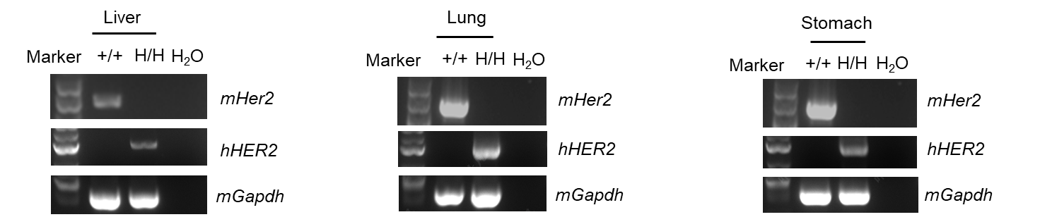 Strain specific analysis of HER2 mRNA expression in wild-type BALB/cCrSlcNifdc and B-hHER2 mice(C) by RT-PCR. Liver, lung and stomach RNA were isolated from wild-type BALB/cCrSlcNifdc (+/+) and homozygous B-hHER2 mice(C) (H/H), then cDNA libraries were synthesized by reverse transcription, followed by PCR with mouse or human HER2 primers. Mouse Her2 mRNA was detectable only in wild-type B-NDG mice. Human HER2 mRNA was detectable only in homozygous B-hHER2 mice(C) but not in wild-type mice.