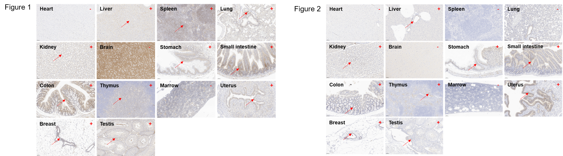 Immunohistochemical (IHC) analysis of HER2 protein expression in wild-type BALB/cCrSlcNifdc mice and B-hHER2 mice(C). Fourteen major tissues were collected from wild-type BALB/cCrSlcNifdc mice and homozygous B-hHER2 mice(C) and analyzed by IHC with anti-mouse HER2 antibodies (ab214275) and anti-human HER2 antibodies (ab16662). Mouse HER2 was detected in the lung, kidney, stomach, small intestine, colon, thymus, uterus, breast, testis, liver and spleen of wild-type mice (Figure 1). Human HER2 was detected in the lung, kidney, stomach, small intestine, colon, thymus, uterus, breast and testis of homozygous B-hHER2 mice(C) (Figure 2).