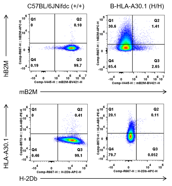 Strain specific B2M and HLA-A30.1 expression analysis in wild-type C57BL/6JNifdc mice and homozygous humanized B-HLA-A30.1 mice by flow cytometry. Splenocytes were collected from wild-type C57BL/6JNifdc mice (+/+) and homozygous B-HLA-A30.1 mice (H/H), respectively, and analyzed by flow cytometry with species-specific anti-HLA-A30.1 (Biolegend, 311406), anti-H-2Db (Biolegend, 111513), anti-hB2M (Biolegend, 395712), and anti-mB2M (BD Biosciences, 744802) antibody. HLA-A30.1 and human B2M were exclusively detectable in homozygous B-HLA-A30.1 mice.