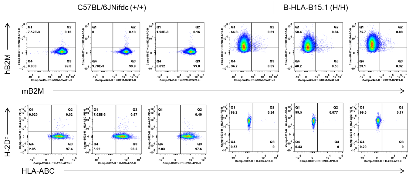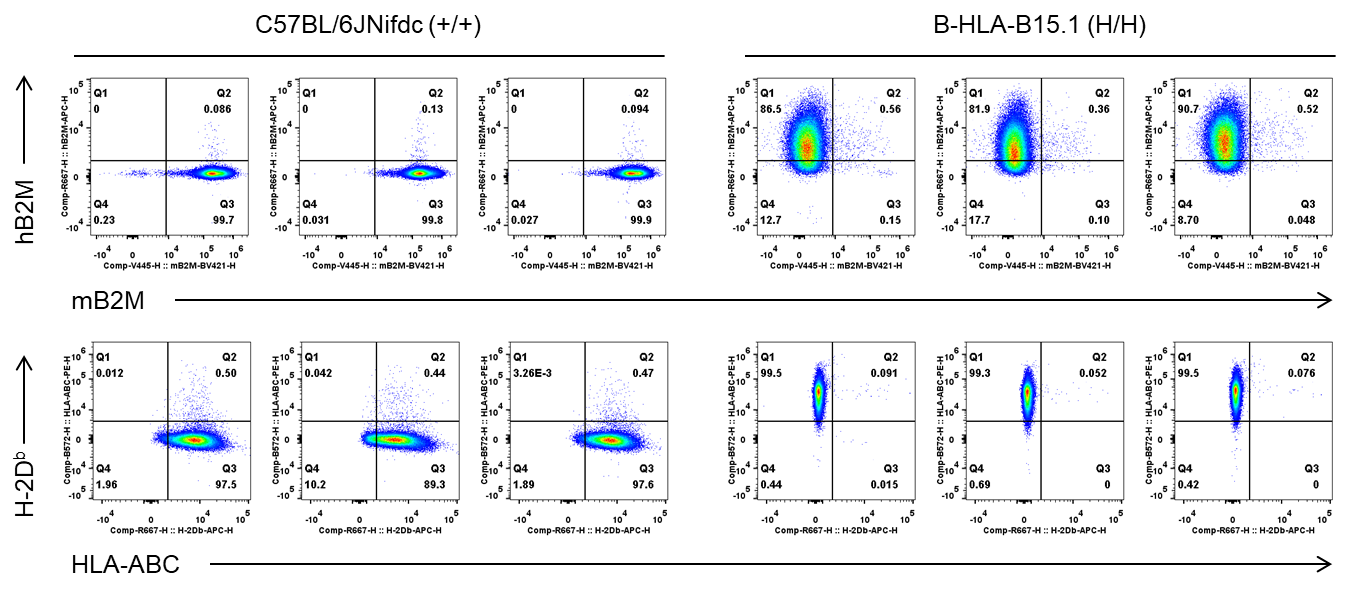 Strain specific B2M and HLA-B15.1 expression analysis in wild-type C57BL/6JNifdc mice and homozygous humanized B-HLA-B15.1 mice by flow cytometry. Blood cells were collected from wild-type C57BL/6JNifdc mice (+/+) and homozygous B-HLA-B15.1 mice (H/H), respectively, and analyzed by flow cytometry with species-specific anti-HLA-ABC antibody (Biolegend, 311406), anti-H-2Db antibody (Biolegend, 111513), anti-hB2M antibody (Biolegend, 395712), and anti-mB2M antibody (BD Biosciences, 744802) antibody. HLA-B15.1 and human B2M were exclusively detectable in homozygous B-HLA-B15.1 mice.