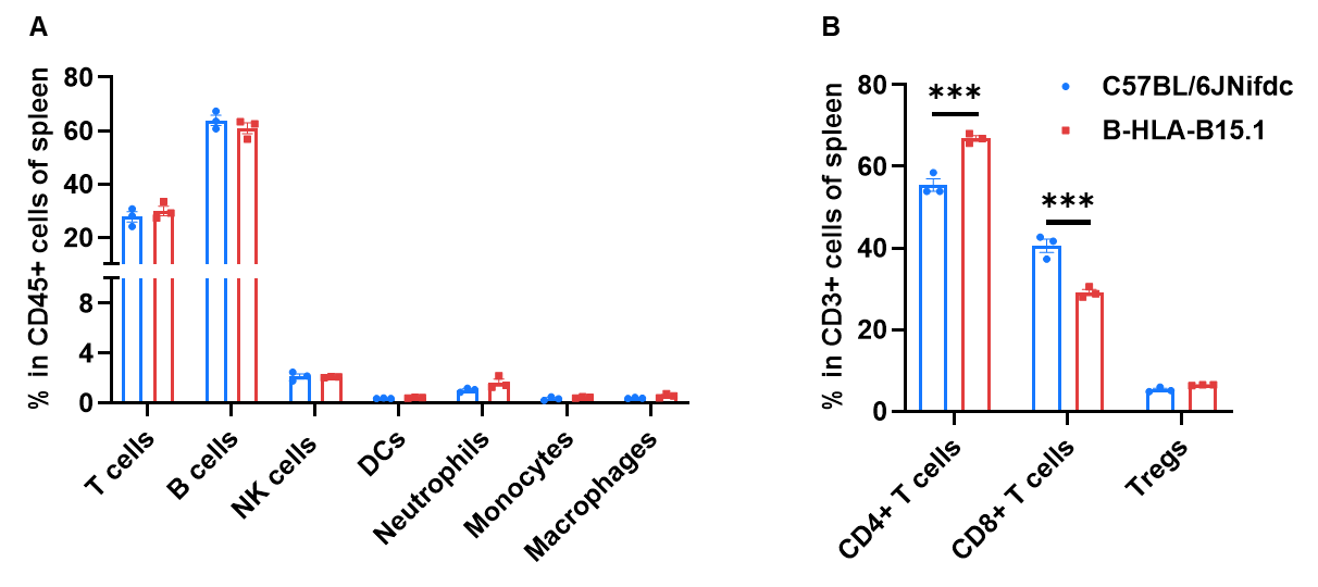 Frequency of leukocyte subpopulations in spleen by flow cytometry. Splenocytes were isolated from wild-type C57BL/6JNifdc mice and homozygous B-HLA-B15.1 mice (female, 14-week-old, n=3). A. Flow cytometry analysis of the splenocytes was performed to assess the frequency of leukocyte subpopulations. B. Frequency of T cell subpopulations. Frequencies of NK cells, dendritic cells, monocytes, macrophages, neutrophils and Tregs in B-HLA-B15.1 mice were similar to those in C57BL/6JNifdc mice. Frequency of CD8+ T cells in B-HLA-B15.1 mice were lower than in C57BL/6JNifdc mice, whereas the percentage of CD4+ T cells in B-HLA-B15.1 mice were higher than in C57BL/6JNifdc mice. Values are expressed as mean ± SEM. Significance was determined by two-way ANOVA test.  *P < 0.05, **P < 0.01, ***p < 0.0001.