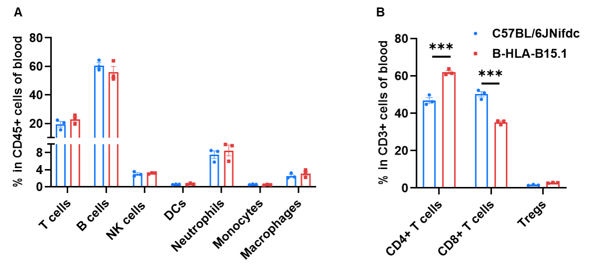 Frequency of leukocyte subpopulations in blood by flow cytometry. Blood were isolated from wild-type C57BL/6JNifdc mice and homozygous B-HLA-B15.1 mice (female, 14-week-old, n=3). A. Flow cytometry analysis of the blood was performed to assess the frequency of leukocyte subpopulations. B. Frequency of T cell subpopulations. Frequencies of NK cells, dendritic cells, monocytes, macrophages, neutrophils and Tregs in B-HLA-B15.1 mice were similar to those in C57BL/6JNifdc mice. Frequency of CD8+ T cells in B-HLA-B15.1 mice were lower than in C57BL/6JNifdc mice, whereas the frequency of CD4+ T cells in B-HLA-B15.1 mice were higher than in C57BL/6JNifdc mice. Values are expressed as mean ± SEM. Significance was determined by two-way ANOVA test.  *P < 0.05, **P < 0.01, ***p < 0.0001.