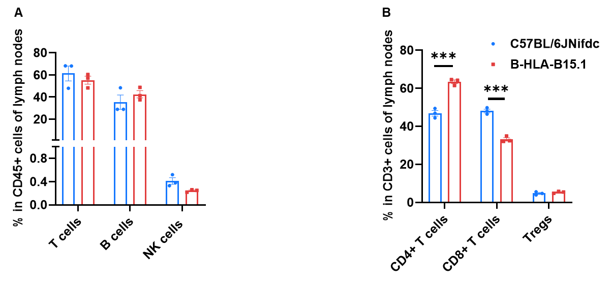 Frequency of leukocyte subpopulations in lymph node by flow cytometry. Lymph node cells were isolated from wild-type C57BL/6JNifdc mice and homozygous B-HLA-B15.1 mice (female, 14-week-old, n=3). A. Flow cytometry analysis of the lymph node was performed to assess the frequency of leukocyte subpopulations. B. Frequency of T cell subpopulations. Frequencies of B cells, NK cells and Tregs in B-HLA-B15.1 mice were similar to those in C57BL/6JNifdc mice. Frequency of CD8+ T cells in B-HLA-B15.1 mice were lower than in C57BL/6JNifdc mice, whereas the frequency of CD4+ T cells in B-HLA-B15.1 mice were higher than in C57BL/6JNifdc mice. Values are expressed as mean ± SEM. Significance was determined by two-way ANOVA test.  *P < 0.05, **P < 0.01, ***p < 0.0001.