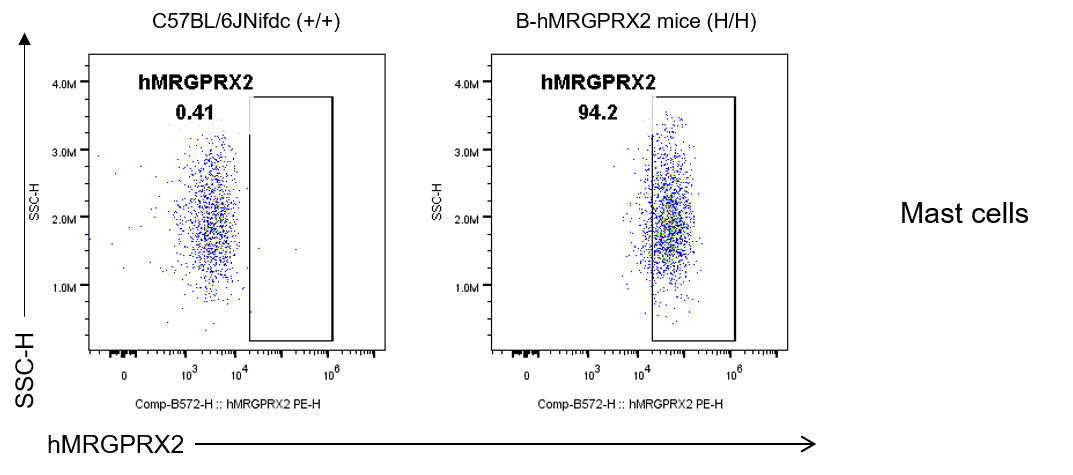 MRGPRX2 expression analysis in homozygous B-hMRGPRX2 mice plus by flow cytometry. Peritoneal lavage fluid cells were collected from wild-type C57BL/6JNifdc mice (+/+) and homozygous B-hMRGPRX2 mice plus (H/H), and analyzed by flow cytometry with anti-human MRGPRX2 antibody (BioLegend, 359004). hMRGPRX2 was detectable in peritoneal lavage fluid mast cells in homozygous B-hMRGPRX2 mice plus, but not in wild-type mice.