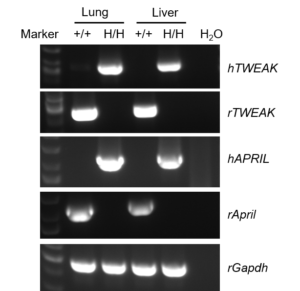 Strain specific analysis of TWEAK and APRIL mRNA expression in wild-type SD rats and B-hTWEAK/hAPRIL rats by RT-PCR. Lung and liver RNA were isolated from wild-type SD rats (+/+) and homozygous B-hTWEAK/hAPRIL rats (H/H), then cDNA libraries were synthesized by reverse transcription, followed by PCR with rat or human TWEAK and APRIL primers. Rat TWEAK and April mRNA were only detectable in wild-type SD rats. Human TWEAK and APRIL mRNA were exclusively detectable in homozygous B-hTWEAK/hAPRIL rats but not in wild-type SD rats.