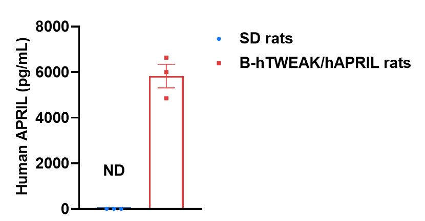 Strain specific APRIL expression analysis in wild-type SD rats and homozygous humanized B-hTWEAK/hAPRIL rats by ELISA. Serum was collected from wild-type SD rats (female, n=3, 14-week-old) and homozygous B-hTWEAK/hAPRIL rats (female, n=3, 14-week-old). Expression levels of human APRIL were analyzed by ELISA (anti-human APRIL ELISA Kit: invitrogen, BMS2008). Human APRIL was exclusively detectable in homozygous B-hTWEAK/hAPRIL rats, but not in wild-type SD rats. Values are expressed as mean ± SEM. ND: not detectable.