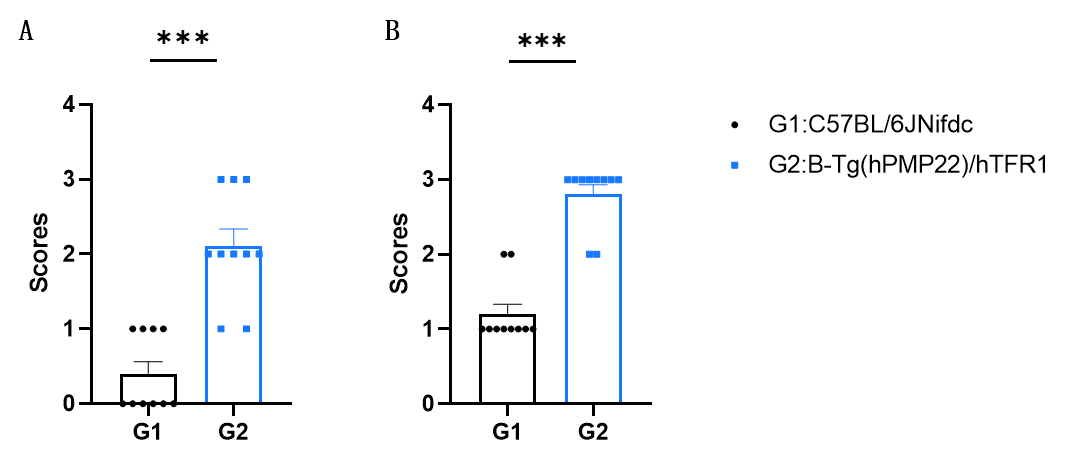 B-Tg(hPMP22)/hTFR1 mice show significantly higher neuroscores versus wild-type mice, suggesting impaired neurological function. Values are expressed as mean ± SEM. Significance was determined by unpaired t-test, *P < 0.05, **P < 0.01, ***P < 0.001.