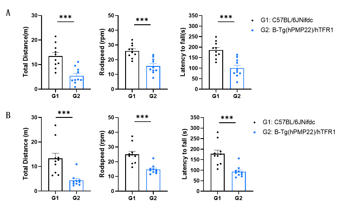 Behavioral performance in wild-type C57BL/6JNifdc and B-Tg(hPMP22)/hTFR1 mice. Rotarod tests were conducted to assay the behavioral performance in wild-type C57BL/6JNifdc and B-Tg(hPMP22)/hTFR1 mice (4-month-old, n=10). A, female. B, male. B-Tg(hPMP22)/hTFR1 mice showed decreased fall latency, glide speed and total distance, showing motor dysfunction at 4 months of age. Values are expressed as mean ± SEM. Significance was determined by unpaired t-test. *P < 0.05, **P < 0.01, ***P < 0.001.