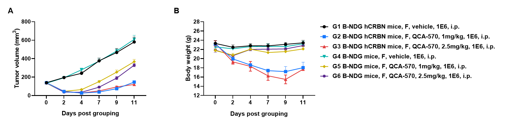 Antitumor activity of dBET6 PROTAC (QCA-570) in B-NDG hCRBN mice.(A) dBET6 PROTAC inhibited MV-4-11 cells tumor growth in B-NDG hCRBN mice. Human myelomonocytic leukemia cell line MV-4-11 cells were subcutaneously implanted into homozygous B-NDG hCRBN mice (female, 8-week-old, n=6). Mice were grouped when tumor volume reached approximately 100-150 mm3, at which time they were intraperitoneally injected with dBET6 PROTAC indicated in panel. (B) Body weight changes during treatment. As shown in panel A, In the MV4;11 xenograft model, QCA-570 achieved tumor regression at 1 and 2.5 mg/kg, demonstrating that B-NDG hCRBN mice provide a powerful preclinical model for in vivo efficacy and safe evaluation of dBET6 PROTAC.