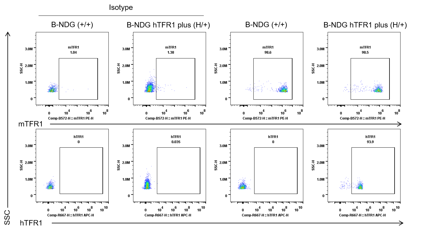 Strain specific TFR1 expression analysis in heterozygous B-NDG hTFR1 mice plus by flow cytometry. Bone marrow was collected from wild-type B-NDG mice (+/+) and heterozygous B-NDG hTFR1 mice plus (H/+). Protein expression was analyzed with anti-mouse TFR1 antibody (Biolegend, 113808) and anti-human TFR1 antibody (Biolegend, 334108) by flow cytometry. Mouse TFR1 was detectable in wild-type B-NDG mice and heterozygous B-NDG hTFR1 mice plus. Human TFR1 was exclusively detectable in heterozygous B-NDG hTFR1 mice plus.