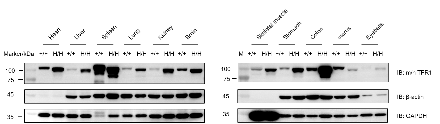 Western blot analysis of TFR1 protein expression in wild-type B-NDG mice and homozygous B-NDG hTFR1 mice plus by WB. Various tissues were collected from wild-type B-NDG mice (+/+) and homozygous B-NDG hTFR1 mice plus (H/H) (female, 6-week-old), and then analyzed by western blot with anti-TFR1 antibody (abcam, ab214039). 40 μg total proteins were loaded for western blotting analysis. GAPDH were detected as internal control. M, marker.