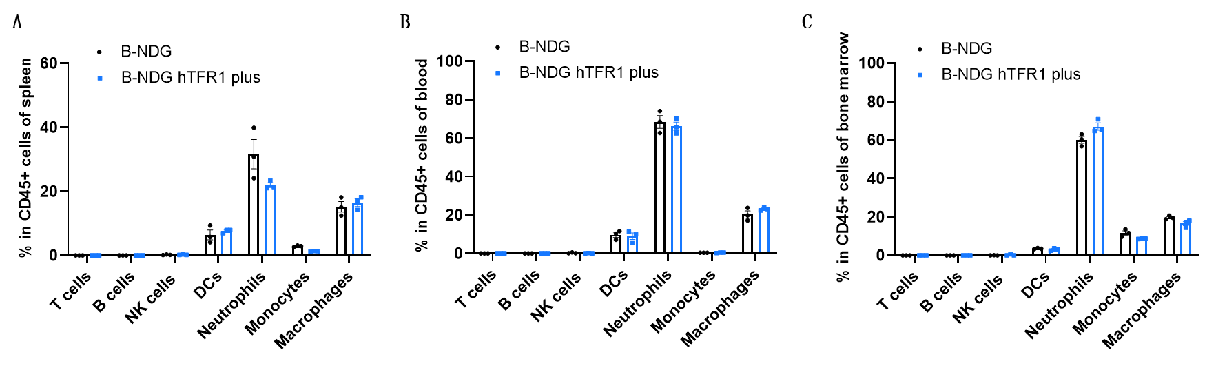 Frequency of leukocyte subpopulations by flow cytometry. Splenocytes (A), blood cells (B) and bone marrow cells (C) were isolated from wild-type B-NDG mice (female, n=3, 9-week-old) and homozygous B-NDG hTFR1 mice plus (female, n=3, 9-week-old). Flow cytometry analysis was performed to assess the frequency of leukocyte subpopulations. B-NDG mice and B-NDG hTFR1 mice plus lack T cells, B cells and NK cells. DCs, neutrophils, monocytes and macrophages in homozygous B-NDG hTFR1 mice plus were similar as in B-NDG mice. Humanization of TFR1 does not change the overall frequency or distribution of immune cell types in spleen, blood and bone marrow. Values are expressed as mean ± SEM. Significance was determined by two-way ANOVA test.
