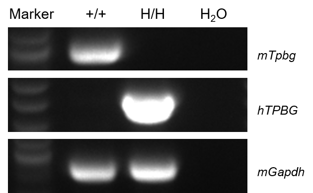 Species specific analysis of TPBG gene expression in wild-type B-NDG mice and homozygous B-NDG hTPBG mice by RT-PCR. The brain tissues were collected from wild-type B-NDG mice (+/+) and homozygous B-NDG hTPBG mice (H/H). Mouse Tpbg mRNA was only detectable in wild-type B-NDG mice. Human TPBG mRNA was only detectable in homozygous B-NDG hTPBG mice, but not in wild-type B-NDG mice.