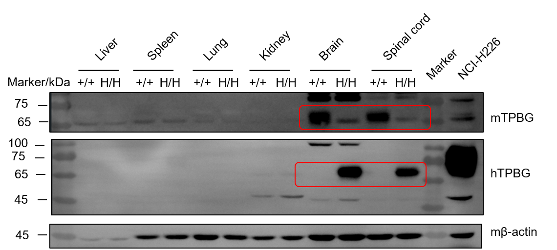 Strain specific TPBG expression analysis in wild-type B-NDG mice (+/+) and homozygous humanized B-NDG hTPBG mice (H/H) by western blot. The tissues of liver, spleen, lung, kidney, brain and spinal cord were collected from wild-type B-NDG mice (+/+) and homozygous B-NDG hTPBG mice (H/H) (female, 7-week-old, n=1). Protein expression was analyzed with anti-mouse TPBG antibody (R&D, AF5049-SP) and anti-human TPBG antibody (Abcam, ab134162) by western blot. Because of the cross-reaction of anti-mouse antibody, TPBG expression can be detected in brain and spinal cord of wild-type B-NDG mice and homozygous B-NDG hTPBG mice. Human TPBG expression can only be detected in brain and spinal cord of B-NDG hTPBG mice, but not in wild-type B-NDG mice.