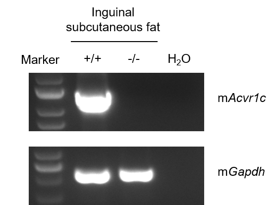 Strain specific analysis of Acvr1c mRNA expression in wild-type C57BL/6JNifdc mice and B-Acvr1c KO mice by RT-PCR. Inguinal subcutaneous fat RNA was isolated from wild-type C57BL/6JNifdc mice (+/+) and homozygous B-Acvr1c KO mice (-/-), then cDNA libraries were synthesized by reverse transcription, followed by PCR with mouse Acvr1c primers. Mouse Acvr1c mRNA was only detectable in wild-type mice but not in B-Acvr1c KO mice.
