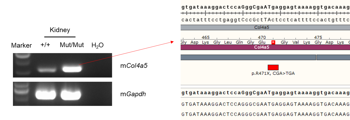 Strain specific analysis of Col4a5 mRNA expression in wild-type C57BL/6JNifdc and B-Col4a5*R471X mice by RT-PCR. Kidney RNA were isolated from wild-type C57BL/6JNifdc (+/+) and homozygous B-Col4a5*R471X mice(Mut/Mut), then cDNA libraries were synthesized by reverse transcription, followed by PCR with mouse Col4a5 primers. Mouse Col4a5 mRNA was both detectable in wild-type mice and homozygous B-Col4a5*R471X mice, and the point mutation was confirmed via Sanger sequencing.