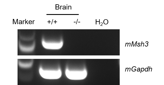 Strain specific analysis of Msh3 mRNA expression in wild-type C57BL/6JNifdc mice and homozygous B-Msh3 KO mice by RT-PCR. Brain RNA were isolated from wild-type C57BL/6JNifdc mice (+/+) and homozygous B-Msh3 KO mice (-/-), then cDNA libraries were synthesized by reverse transcription, followed by PCR with mouse Msh3 primers. Mouse Msh3 mRNA was only detectable in wild-type mice, but not in homozygous B-Msh3 KO mice.
