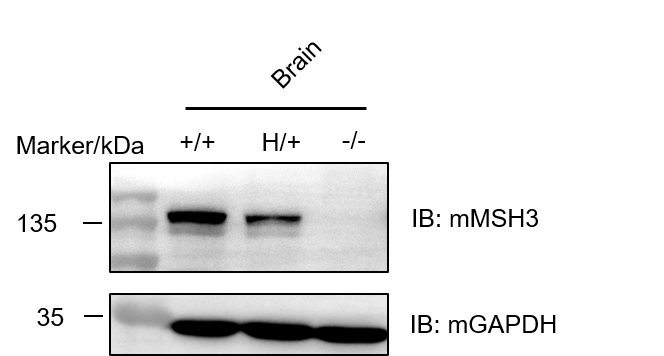 Western blot analysis of MSH3 protein expression in homozygous B-Msh3 KO mice. Various tissue lysates were collected from wild-type C57BL/6JNifdc mice (+/+) , heterozygous B-hMSH3 mice (H/+) and homozygous B-Msh3 KO mice (-/-), and then analyzed by western blot with anti-mouse MSH3 antibody (Millipore, MABE324). 40 μg total proteins were loaded for western blotting analysis. Mouse MSH3 protein was detectable in wild-type mice and heterozygous B-hMSH3 mice, but not in homozygous B-Msh3 KO mice.