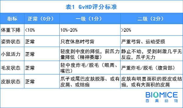 GvHD的机制是供体TCR无法识别受体MHC分子从而将受体识别为“非我”,供体APC细胞活化,通过T细胞对受体细胞进行的杀伤,主要引起皮肤、胃肠道和肝脏损伤等不良反应[2]。在使用免疫缺陷鼠进行人源细胞重建时,接种的人源免疫细胞会对小鼠造成攻击,根据不同的观测指标(如下表)来记录GvHD评分。不同人来源的Donor移植后GvHD反应不同,小鼠的死亡情况也差别较大,我们之前已经进行过探讨,详情请参看:PBMC重建不稳定?三招教你搞定。