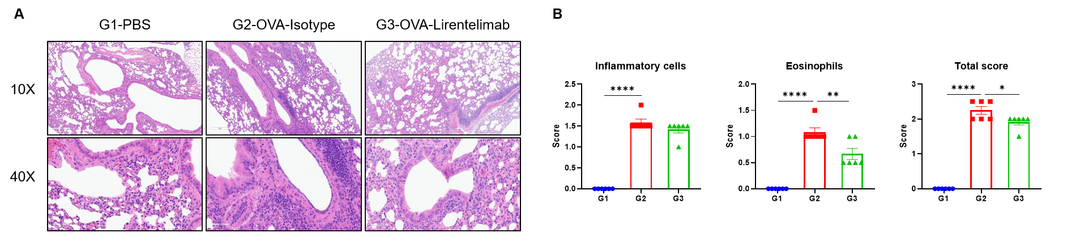 B-hSIGLEC8 小鼠哮喘样模型中的 H&E 染色。(A) 在研究结束时收集肺组织。H&E染色结果显示,暴露于PBS气雾剂的B-hSIGLEC8小鼠的肺组织没有表现出任何炎症。暴露于OVA导致 B-hSIGLEC8 小鼠的支气管周围和血管周围炎症显着增加。(B) 在用 lirentelimab(内部合成)治疗的小鼠中观察到嗜酸性粒细胞浸润显着减少。