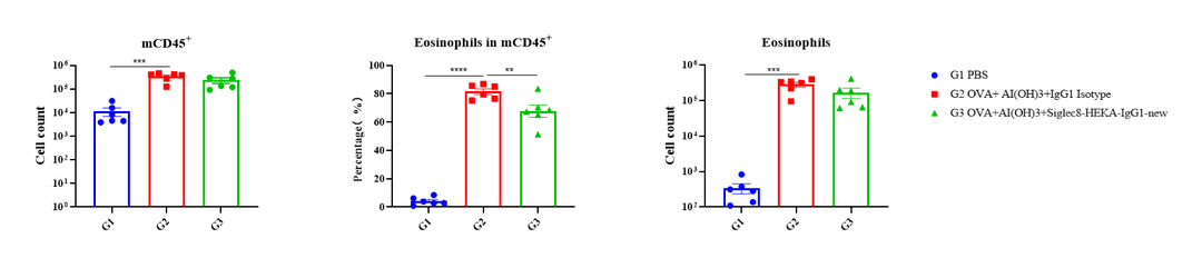 从B-hSIGLEC8小鼠(n=6)中分离出BALF免疫细胞。在PBS或lirentelimab(内部合成)处理下,通过流式细胞术分析嗜酸性粒细胞的数量。lirentelimab 治疗后,纯合 B-hSIGLEC8 小鼠中炎症细胞的表达水平低于阳性对照。