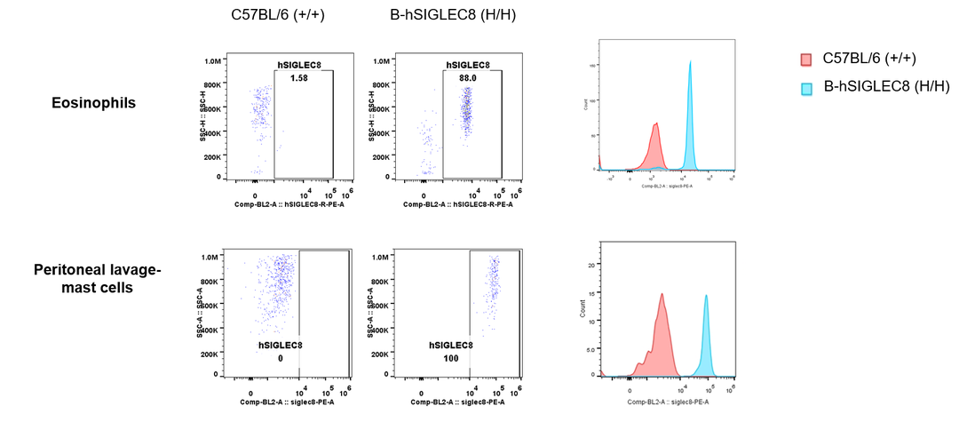 通过流式细胞术分析 B-hSIGLEC8 小鼠的嗜酸性粒细胞和肥大细胞。从野生型 C57BL/6 小鼠和B-hSIGLEC8小鼠中分离出嗜酸性粒细胞和腹膜灌洗肥大细胞。使用基准抗体 Lirentelimab(内部合成)进行流式细胞术分析以评估人 SIGLEC8 表达。Lirentelimab 在纯合 B-hSIGLEC8 小鼠中仅与 SIGLEC8结合,在野生型小鼠中不与 SIGLEC8结合。