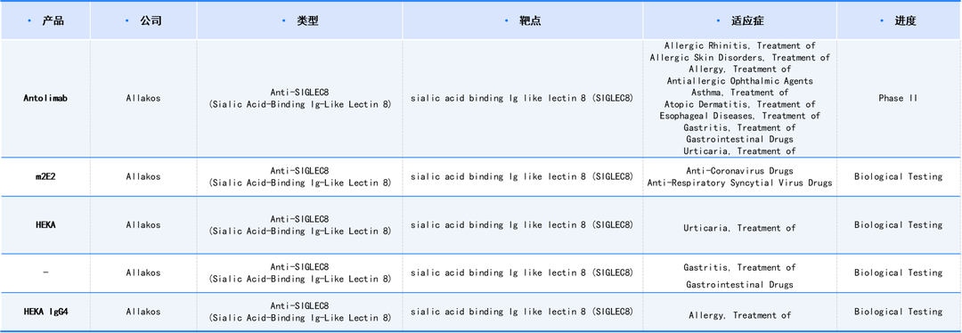 目前以SIGLEC8为靶点的在研药物共5项,开发机构均是Allakos。其中Antolimab(AK-002)处于临床II期,其余四项处于临床前阶段。Antolimab,是一款靶向SIGLEC8的人源重组非岩藻糖基化单克隆IgG1抗体的药物;能够通过SIGLEC8移植肥大细胞和消耗嗜酸性粒细胞,从而抑制有这两类细胞的错误激活导致的一系列疾病,如嗜酸性胃炎(EG)、嗜酸性十二指肠炎(EoD)和嗜酸性食管炎等慢性炎症疾病。2020年5月Allakos公布Antolimab在治疗EG、EoD和嗜酸性食管炎上已经获得了 FDA的孤儿药认定资格。