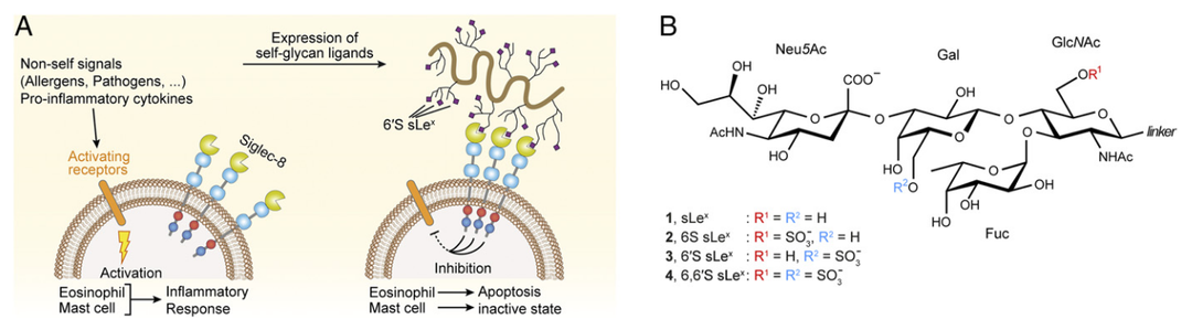图1. SIGLEC8促进嗜酸性粒细胞凋亡并减少肥大细胞炎症反应&SIGLEC8的潜在聚糖配体[2]