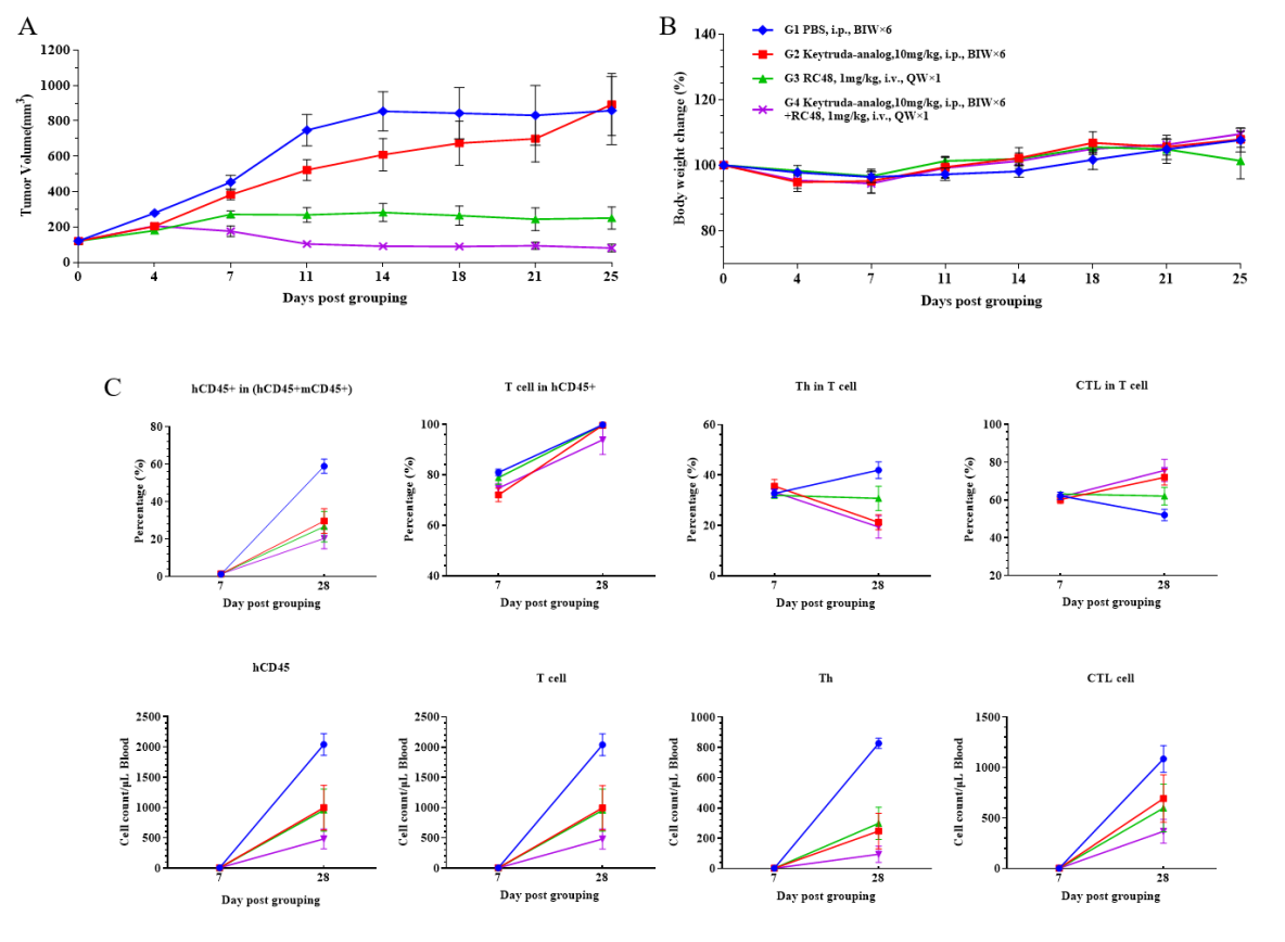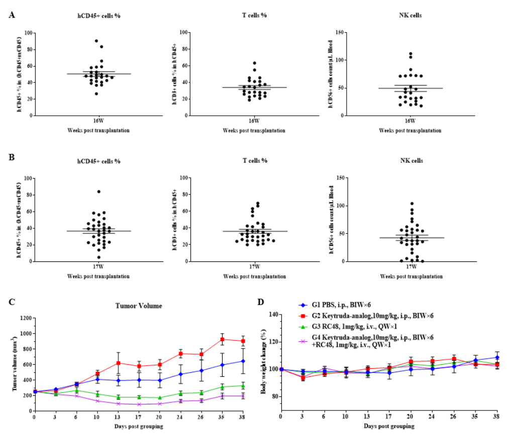在CD34+HSC重建人源化小鼠模型中,使用B-NDG hIL15新生鼠通过颞静脉注射脐带血来源造血干细胞构建CD34+HSC重建小鼠,小鼠重建16周龄时接种NCI-N87细胞,肿瘤体积约250 mm3时,根据肿瘤体积、小鼠体重、hCD45%以及hCD3%进行分组给药。值得注意的是,我们发现重建小鼠在接种肿瘤细胞系后其外周血人免疫细胞亚群的重建水平会有所变化,这在其它CD34+HSC重建小鼠CDX模型中也有发生。体内药效实验给药组别同PBMC重建模型药效实验相同,分别经Keytruda、RC48单独治疗,以及Kaytruda+RC48联合治疗,结果显示HER2 ADC+Keytruda联合治疗NCI-N87的药效好于单一治疗方式(如图4所示)。