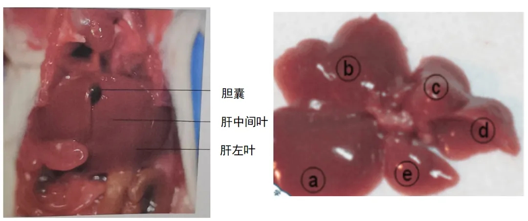 小鼠肝分左叶(a)、中间叶(b)、右叶(c、d)和尾叶(e)。左叶最大,尾叶最小,中间叶有两个侧翼。