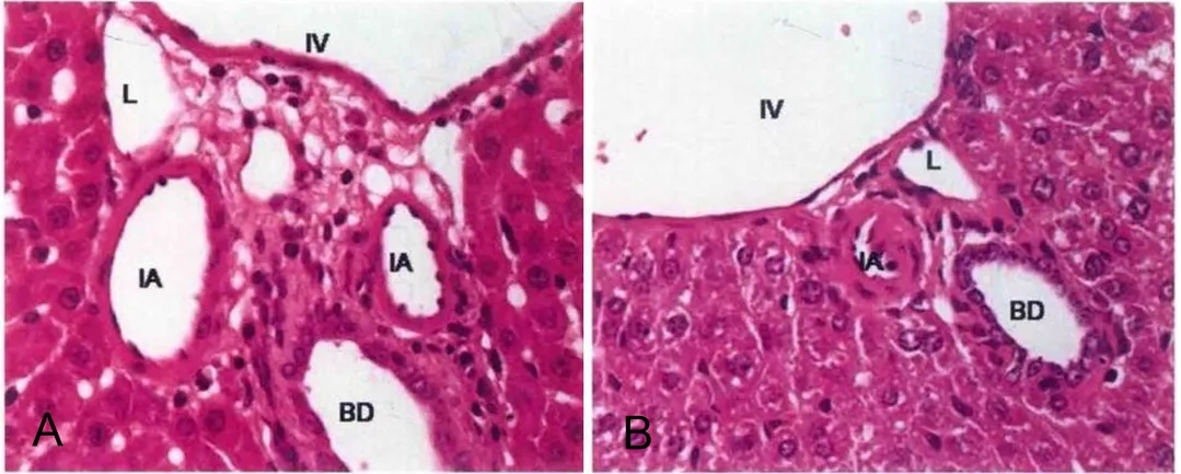 A.SD 大鼠肝门管区 (HE,400×);B. KM小鼠肝门管区( HE, 400×)[2]