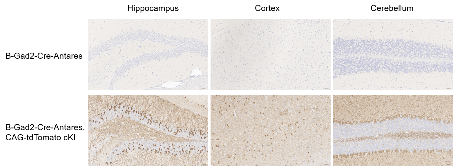 To validate the Cre recombinase activity, B-Gad2-Cre-Antares mice were crossed with CAG-tdTomato cKI reporter mice, utilizing tdTomato expression as an indicator of Cre recombinase activity. Detectable tdTomato expression was observed, confirming the Cre recombinase was functional.