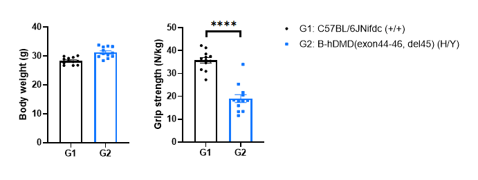 Behavioral performance in wild-type C57BL/6JNifdc and homozygous B-hDMD(exon44-46, del45) mice. Grip strength tests were conducted to assay the behavioral performance in wild-type C57BL/6JNifdc and homozygous B-hDMD(exon44-46, del45) mice (male, 3-month-old, n=12). Grip strength results showed the strength produced by forelimb was ~19 N/kg in homozygous B-hDMD(exon44-46, del45) mice, which was significant weaker than that in wild-type control mice. All grip strength measurements are normalized to the individual animal’s body weight. Values are expressed as mean ± SEM. Significance was determined by unpaired t test. *P < 0.05, **P < 0.01, ***P < 0.001, ****P < 0.0001.