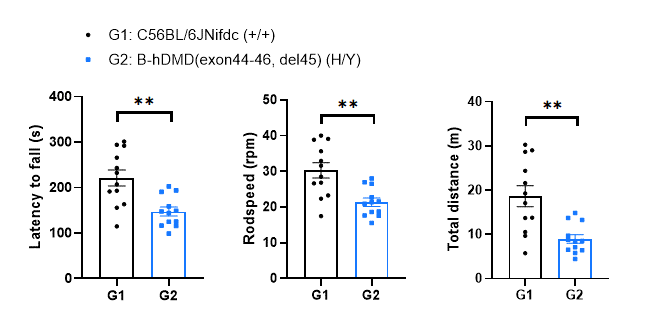 Behavioral performance in wild-type C57BL/6JNifdc and homozygous B-hDMD(exon44-46, del45) mice. Rotarod tests were conducted to assay the behavioral performance in wild-type C57BL/6JNifdc and homozygous B-hDMD(exon44-46, del45) mice (male, 3-month-old, n=12). Rotarod tests were performed to assay the motor coordination. The latency to fall, rodspeed and total distance were significantly decreased in homozygous B-hDMD(exon44-46, del45) mice, showing the impairment of motor coordination and balance. Values are expressed as mean ± SEM. Significance was determined by unpaired t test. *P < 0.05, **P < 0.01, ***P < 0.001, ****P < 0.0001.